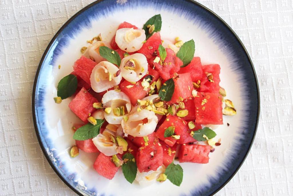 In a bowl, add a half/half ratio of watermelon/lychee and a bit of fresh mint. Then drizzle over just a bit of rose water- not too much so it’s not overpowering.