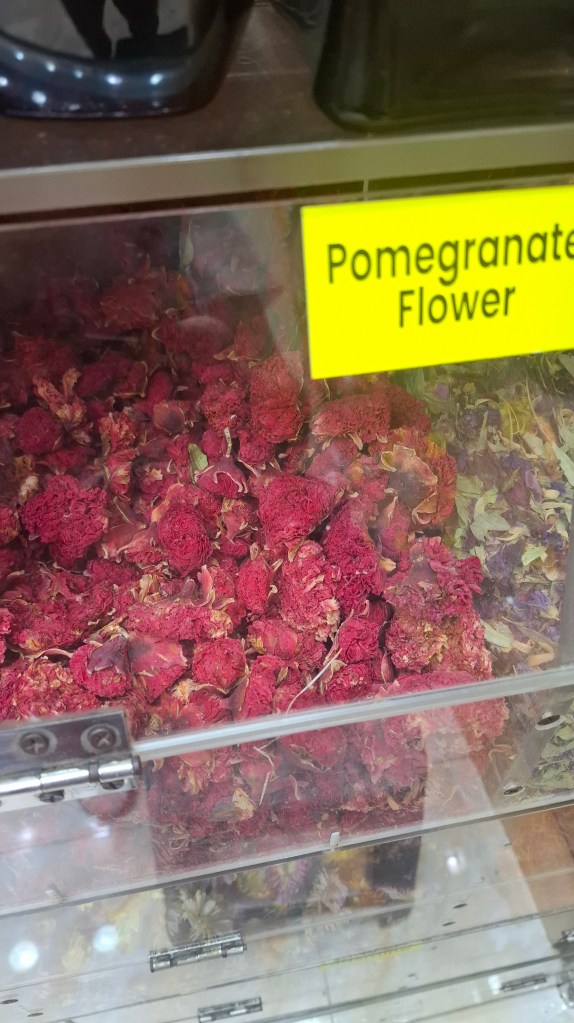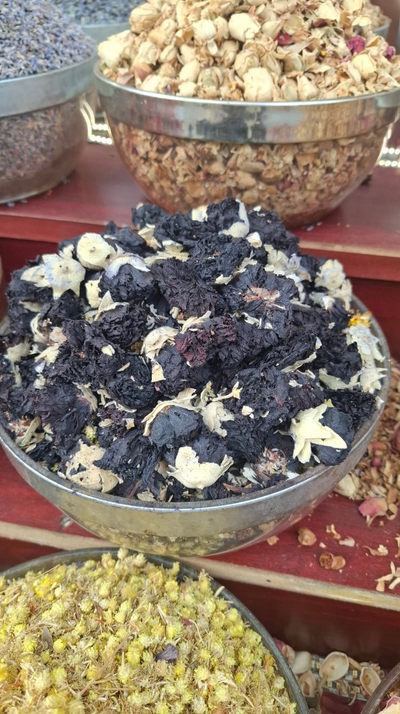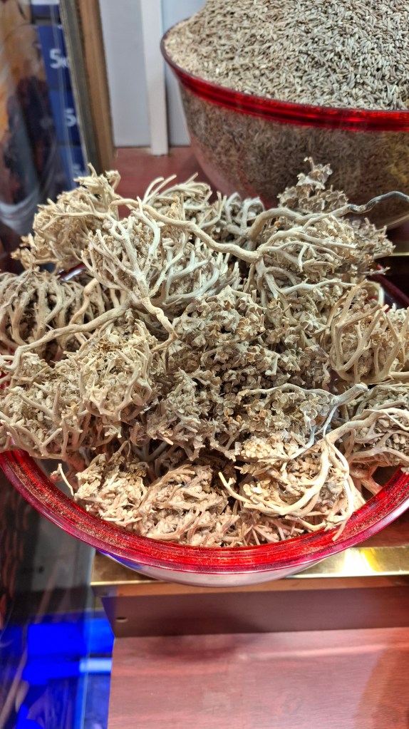 This was my fourth trip to Dubai, but the last time I had been was in 2008. Sixteen years ago, at the souq, I had taken a picture of an interesting looking ingredient and I saw it again during this trip. I recall that the last time, the market vendor was a bit timid in explaining what the plant was good for, so I asked again, and also received a timid answer “it’s used for women”, followed by a facial expression which implied that the topic is a bit too intimate for the male vendor to explain to me. Thankfully, I’m a research nut and that is when I learned that Maryam Booti, both flower and leaves, is used during labour. As a medicinal preparation, it is reconstituted in water and taken internally to bring pain relief and support for childbirth. Traditional midwives also use it as a visual tool for mothers who are in labour. The flower is left to soak in warm water- the mother focuses on the observing the flower expand in water, helping her cervix expand more “peacefully” in the process too.