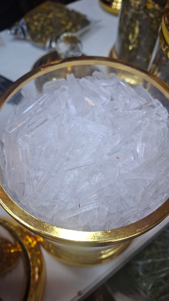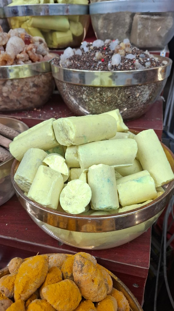 The sight of sulfur sticks piled up high on a platter was a common sight at the souq in Dubai- and I had also previously seen it in Morocco and India. Sulfur has been used in traditional medicine to treat skin conditions such as acne or fungal infections. It helps kill bacteria and reduce sebum when used as a cleanser- but always do a patch test first, especially if you have sensitive skin. It’s also believed to be beneficial for respiratory and digestive health when used in certain formulations. The sticks are also used in pain relief, as they can reduce the electrostatic charge that specifically causes the pain. To discharge the electrostatic charge, just roll the sulfur stick up and down on the affected areas with light pressure for about 1-2 minutes. In some traditions, sulfur is used to ward off negative energies and is burned or applied in specific rituals for purification or protection.