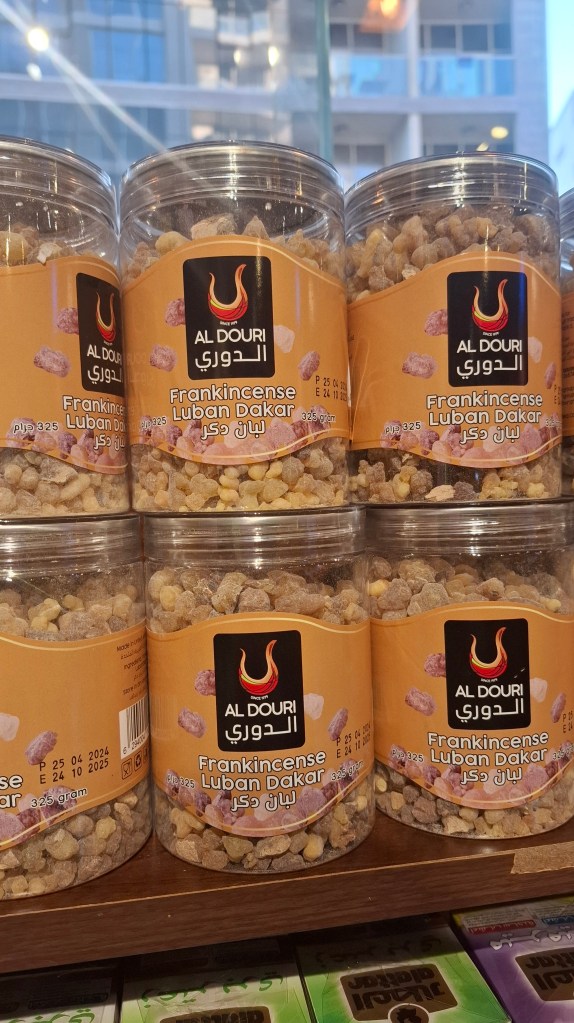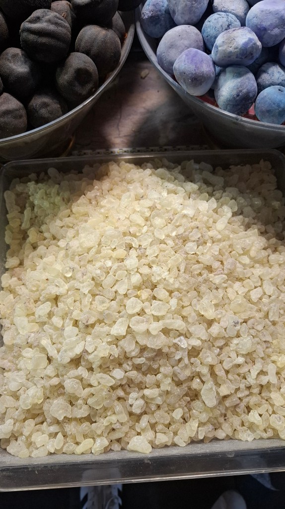 Aside of Frankincense being appreciated for its incredible fragrance, it is also highly medicinal. Native to the Arabian Peninsula, Frankincense is used as an anti-inflammatory and to relieve pain, particularly for joint conditions like arthritis. It is also believed to have respiratory benefits and is used in aromatherapy to reduce anxiety and improve focus. You can also chew on frankincense as a mouth freshener, or suck on a granule if you have nausea. A good health tonic is to leave some frankincense granules soaked in water, and drink the strained water the next day. Frankincense also has tremendous cosmetic qualities- at the souq, I came across skin potions from the Gulf region that contained frankincense, mixed into rich moisturizing creams. When you char the granules, you can also make a natural khol (and khol helps ward off evil energies). Frankincense is highly regarded in spiritual rituals for its purifying qualities. It’s burned as incense in prayers, meditation, and ceremonies to create a sacred atmosphere and to cleanse spaces of negative energies. Of course, if using Frankincense, always make sure it’s pure and of good quality.