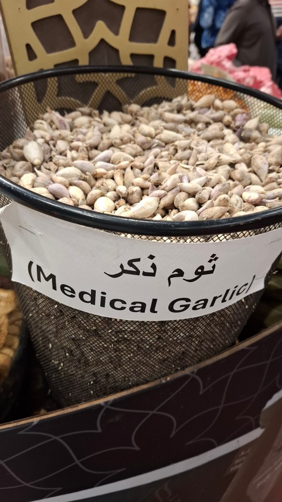 Another interesting sight was buckets of medical grade garlic. The garlic I saw comes from Yemen, where there is a “male garlic” variety that is especially known for its nutritional and therapeutic properties that are stronger than those found in regular garlic. It contains an abundant amount of fiber that is beneficial to the digestive system and disinfectants anything that should not be in your stomach. It contains twice the amount of antibiotics to eliminate infections and get rid of toxins, harmful chemicals, bacteria and parasites. Other interesting uses in ancient Arab Medicine is to use garlic cloves to relieve an ant bite or a bee sting. In the deserts of the Gulf region, scorpions are a common sight especially at night. Rubbing a raw garlic clove on a scorpion sting helps heal the skin. You can also clean wounds by mixing ground garlic in warm water and washing the wound with it to kill the microbes.