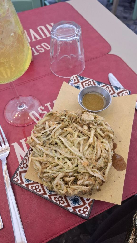 For lunch, sample Rome’s famous street foods: supplì (fried rice balls filled with cheese), Roman pizza al taglio (crispy pizza sold by weight, including interesting veg options like potatoes, zucchini and eggplant), or a classic maritozzo (a sweet brioche bun filled with whipped cream). These foods are all typical of Rome!