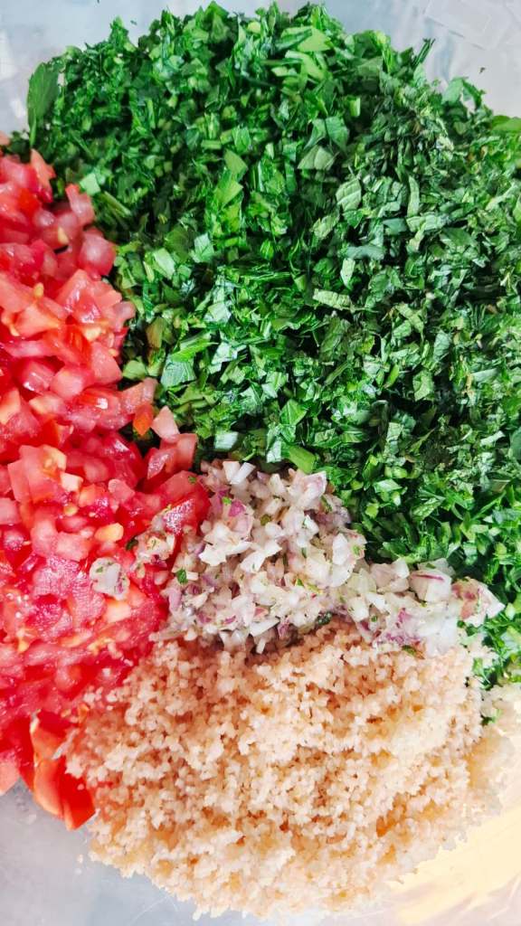 Of course, every region and family may add their little twist. For example, I know Lebanese cooks who add cinnamon or seven-spice, something I absolutely did not see growing up in my Syrian side of the family. But the base must include the seven ingredients I mentioned: parsley, mint, tomato, onion, lemon, olive oil, and burghul—with parsley always as the predominant ingredient.