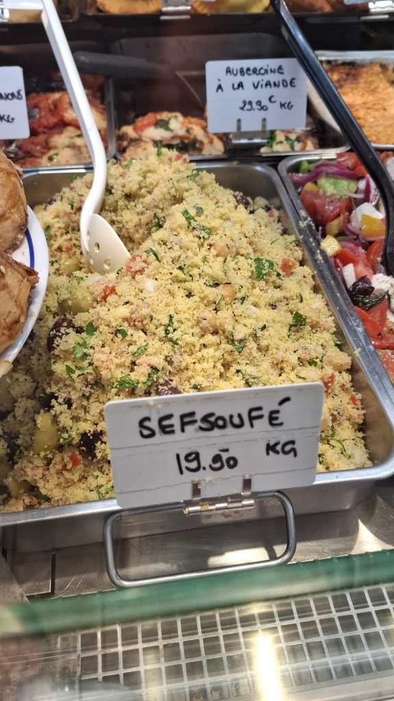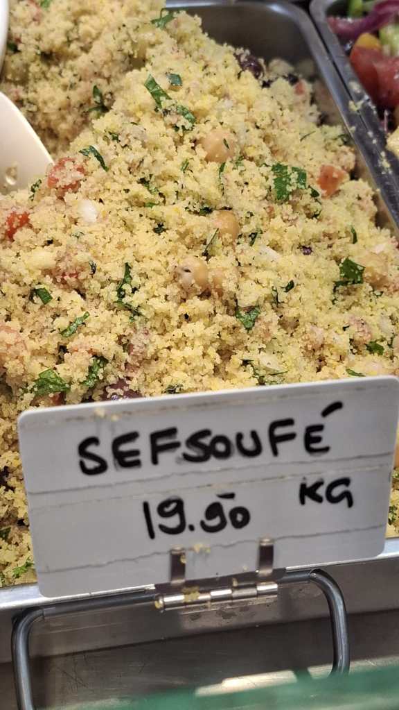Within the Maghreb itself, there exists a dish called safsouf/seffa/mesfouf, a couscous preparation that can be sweet (with dates, almonds, or raisins) or savory (with steamed vegetables). The savory style in particular, a lighter and more vegetable-forward couscous recipe, may in fact have been a conceptual bridge toward what French supermarkets now sell as taboulé. And I’ve even seen a mysterious “sefsoufé” at a traiteur one day, with the dish looking quasi identical to French tabboulé. Seen through this lens, French taboulé is less a mistranslation of Levantine tabbouleh than it is a hybrid—where the Levantine parsley salad met North African couscous culture and adapted itself to the French market.