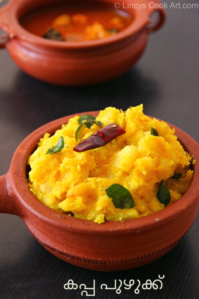 - Kappa Puzhukku- boiled tapiocas cooked in a ground paste of coconut and spices, seasoned with sauteed onions, red cillies, mustard seeds and curry leaves.